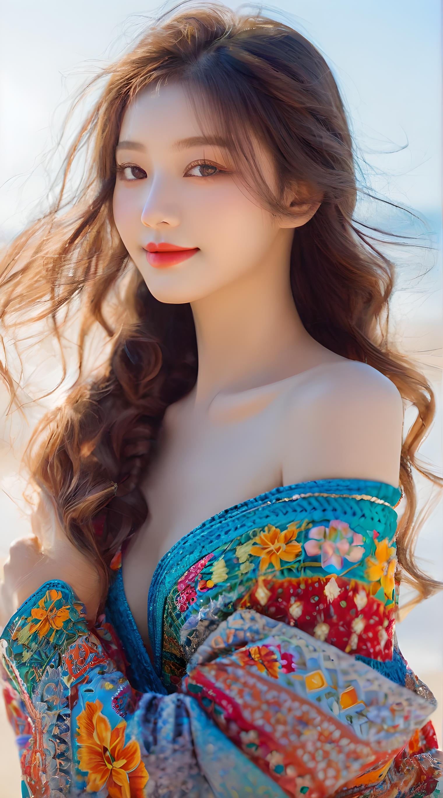 极致漂亮细腻的,(淡妆),黑色长卷发,甜美可人的笑容,彩虹色亮光长发麻花辫子,彩色清澈眼眸,头戴五颜六色的花,细腻漂亮白皙的皮肤,手指优化,逼真写实的,精致的五官,脸部刻画详细,高鼻梁,性感橘红色口红,漂亮温柔美少女,飘柔顺滑发丝,阳光,活泼,楚楚可人,极致细腻的头发,柔美的气质,高盘发,脸部补光,超现实,写实,8K画质,极端细节,逼真细节,大师作品,逼真极致,完美身材,绝美,纯欲,绝色美女,绝世佳人,青春年华,最高画质,8k分辨率,女神,微笑,精细五官,面向观者,头发过肩,棕发,大长腿,侧身,(露肩),((红色系休闲外套))),阳光,海滩, 不暴露