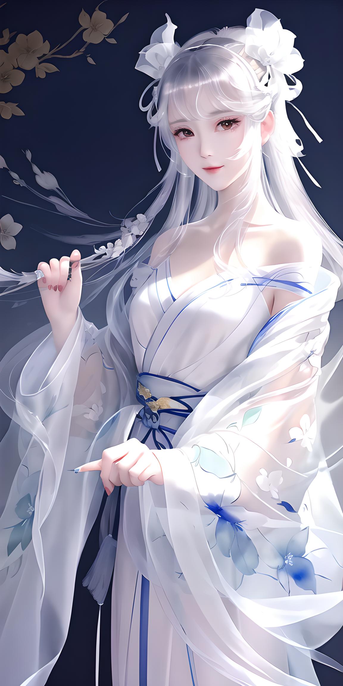 少女 白色飘逸长发 头带雪纺透明蝴蝶发带 雪纺透明露肩汉服 正面微笑