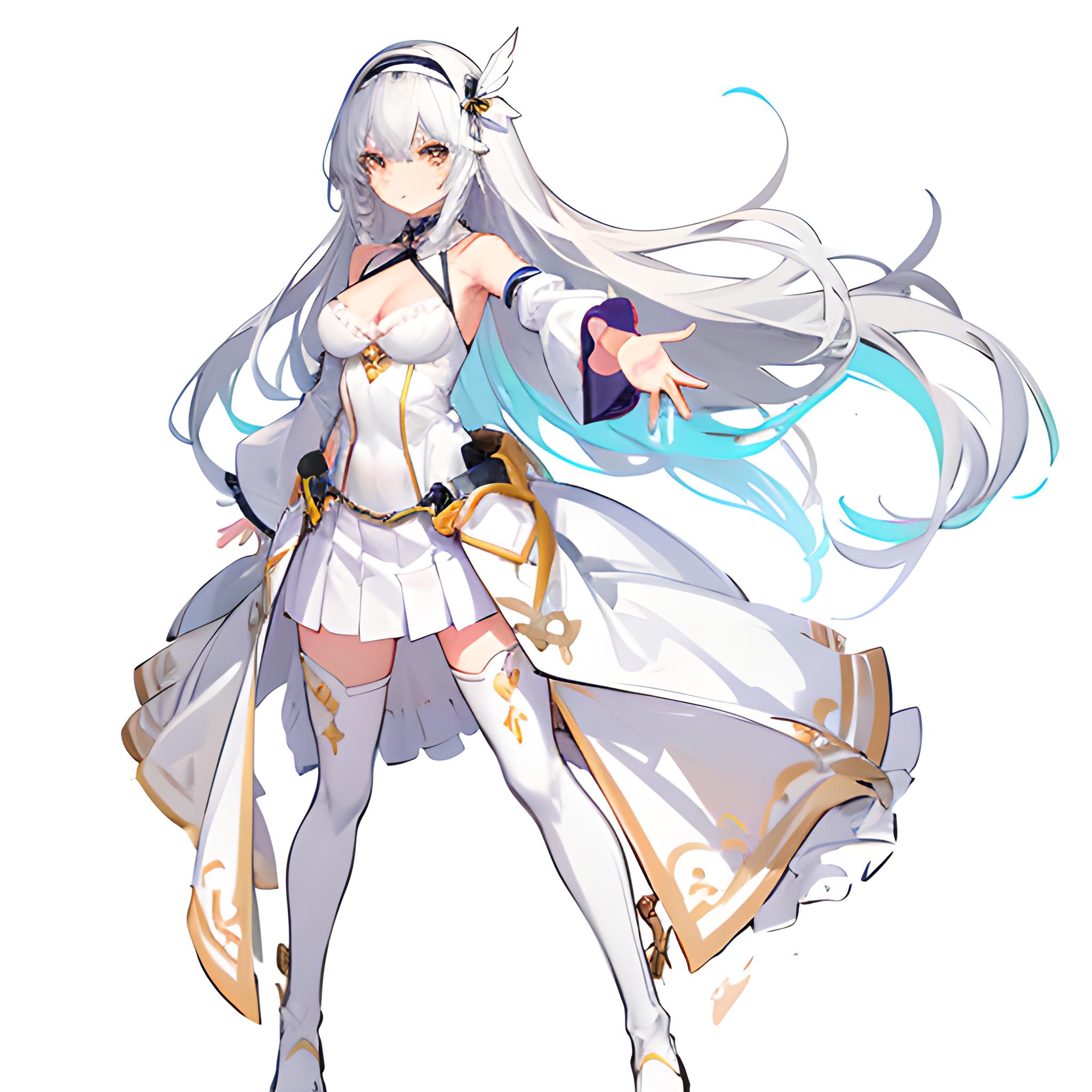 1girl,bare_shoulders,boots,breasts,cleavage,detached_sleeves,dress,full_body,hair_between_eyes,hair_ornament,hairband,long_hair,looking_at_viewer,medium_breasts,outstretched_arm,outstretched_hand,pleated_skirt,silver_hair,simple_background,skirt,solo,standing,thigh_boots,thighhighs,very_long_hair,white_background,white_dress,white_footwear,white_hair,white_legwear,white_sleeves,yellow_eyes